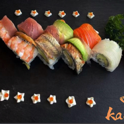 Saumon, thon, dorade, anguille, scampis, avocat, mangue, cheese, riz vinégré, algue 8pcs
