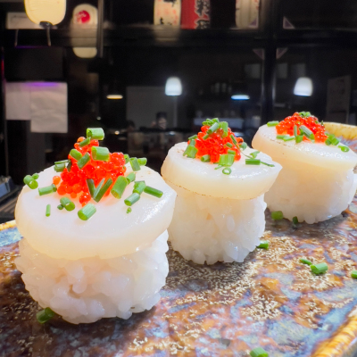 Saint-jacques, masago, ciboulette, riz vinaigré