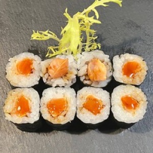 Saumon cuit (menthe, nanami seasoning, mayonnaise, soja salé, soja sucré), riz vinaigré, algue