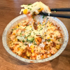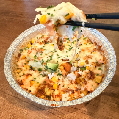 Saumon, avocat, mangue, tomate, mayonnaise, mozzarella, oignons sec, ciboulette, riz vinaigré, sauce tataki
