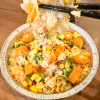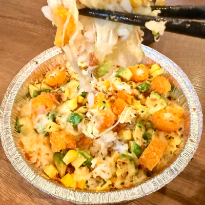Chicken, avocat, mangue, tomate, mayonnaise, mozzarella, oignons sec, ciboulette, riz vinaigré, sauce tataki