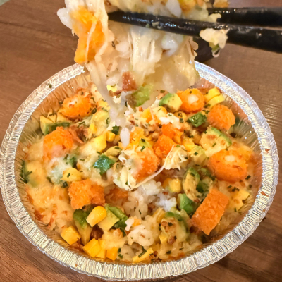 Saumon, Tempura, avocat, mangue, mozzarella, oignons sec, ciboulette, riz vinaigré, sauce tataki